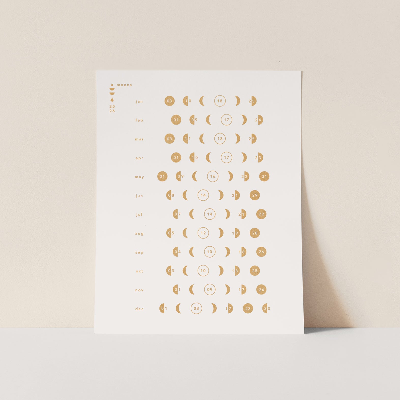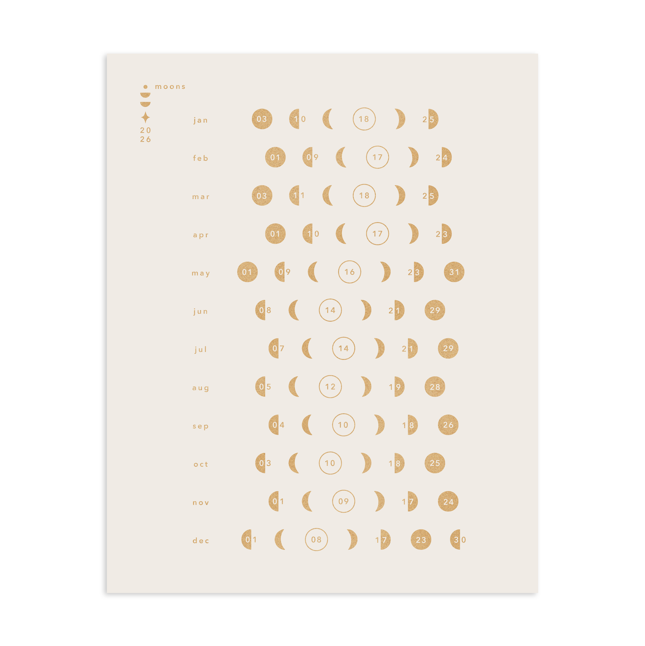Each print has lunar phases for the full moons, new moons, and each quarter for 2026. Screen printed with love in-house with metallic gold ink on a thick and perfectly off-white paper - it's absolutely a treasure!