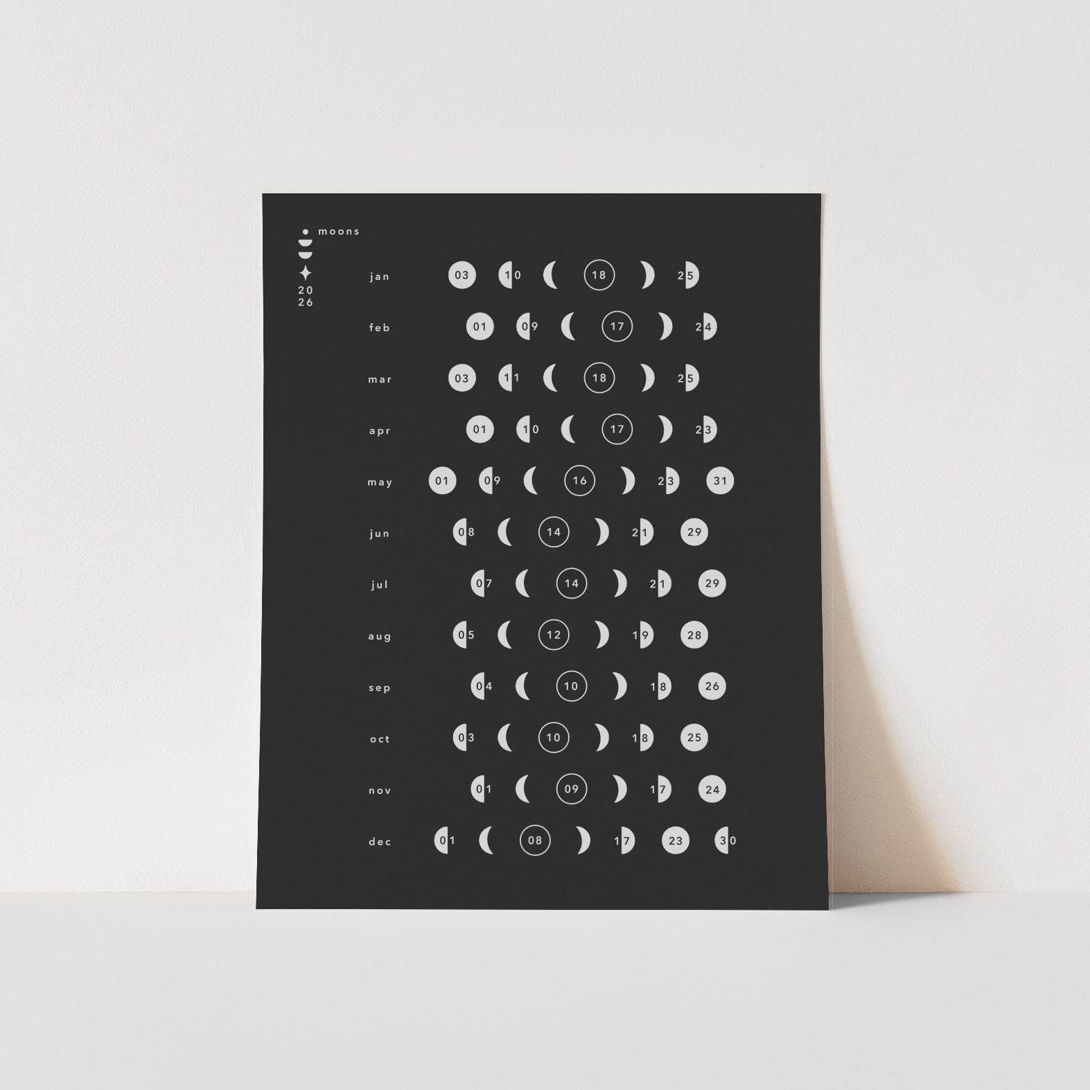 Each print has lunar phases for the full moons, new moons, and each quarter for 2026. Screen printed with love in-house with white ink on a thick black paper - it's absolutely a treasure!