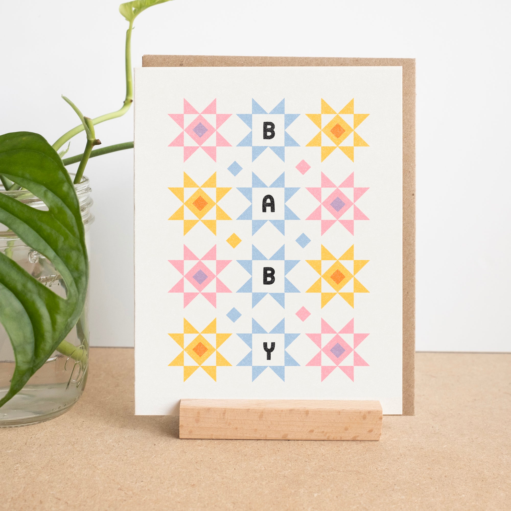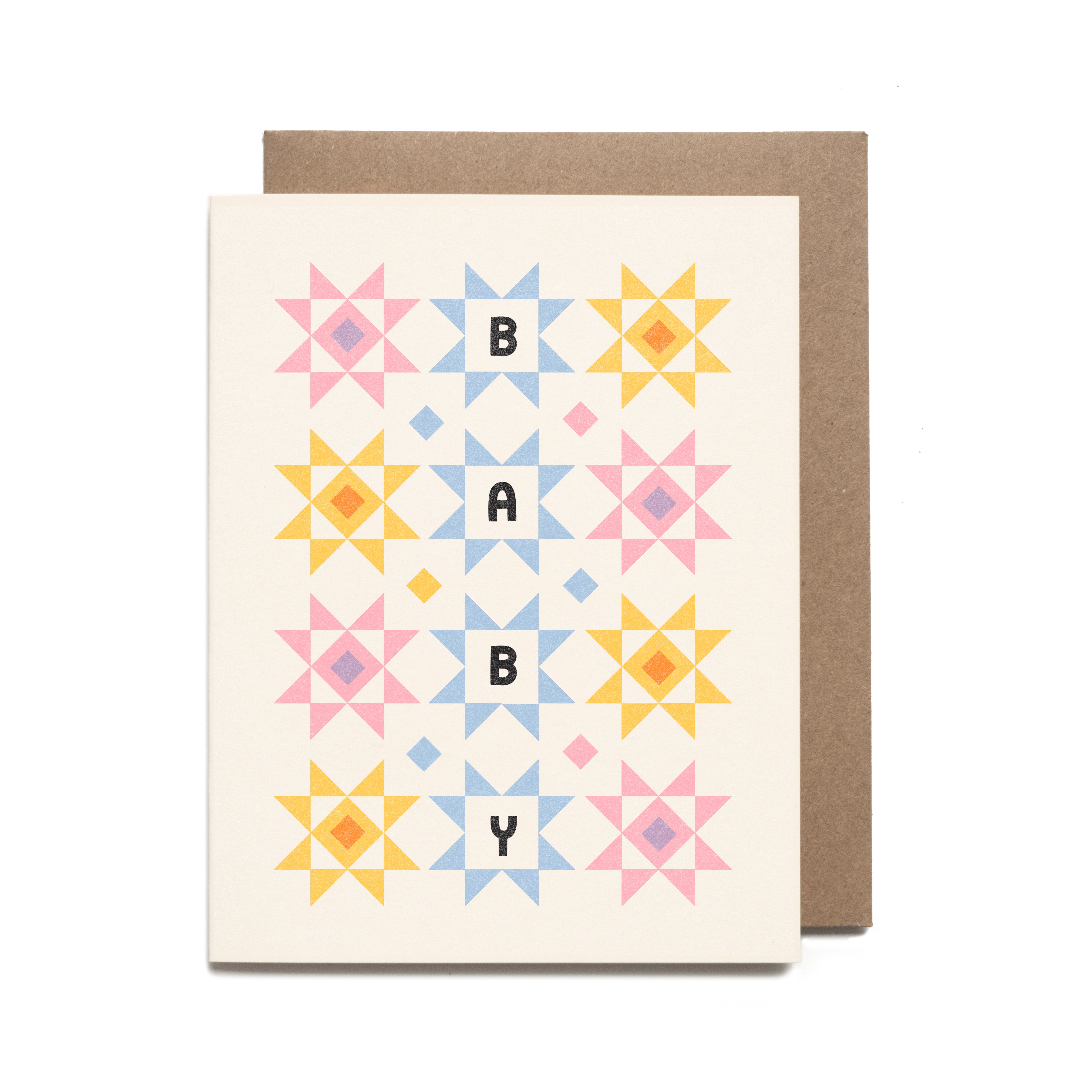 A cozy and colorful quilt block inspired card to welcome a new baby.